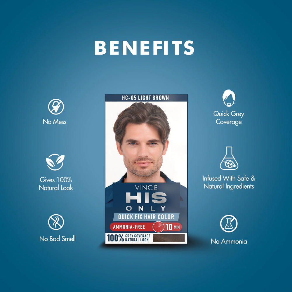 Vince HIS ONLY men hair color is a special formula that gives instant color transformation and makes your hair look as natural as ever without any irritation.