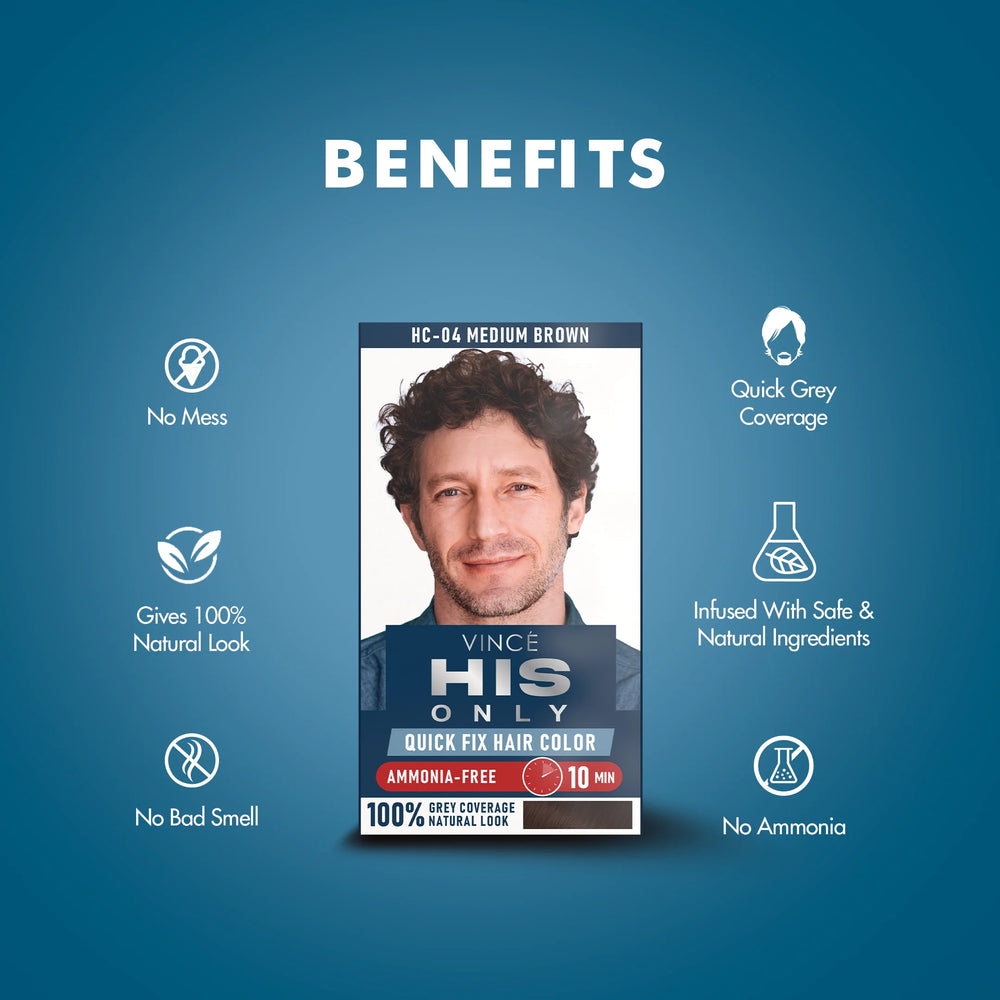 Vince HIS ONLY men hair color is a special formula that gives instant color transformation and makes your hair look as natural as ever without any irritation.